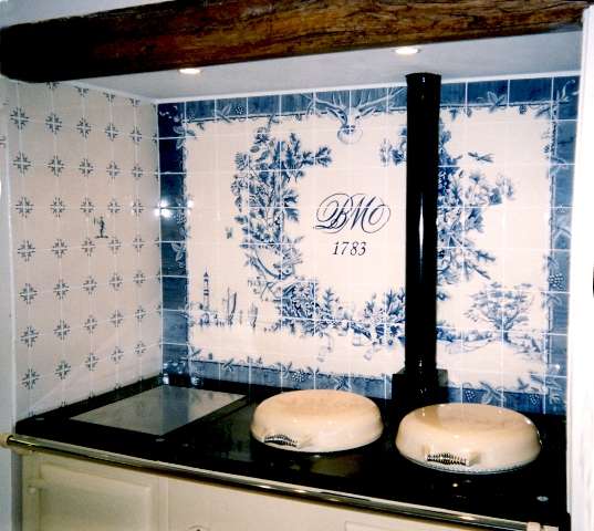 Here, some simple and traditional blue and white Delft-style tiles have created a fresh, pretty effect in a stove alcove. The client has personalised it with initials and dates which are special to them.